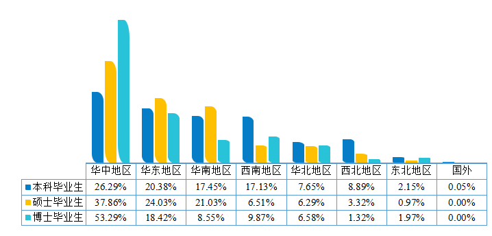 就业区域:华中地区(33.72%)为2022届毕业生就业主战场,华东地区(22.44%)和华南地区(19.27%)次之。不同学历毕业生就业区域分布详见下图。