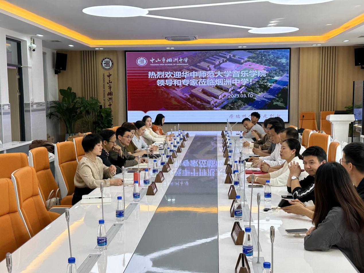3月10日上午,考察组一行前往中山市烟洲中学调研交流。考察组一行参观了烟洲中学优美的校园环境和先进的教学设施,包括文渊阁图书馆、航空航天实验室、智慧音乐教室、恒温恒湿游泳馆等。市教体局体卫艺科四级主任科员李艺,烟洲中学党总支书记、校长周建刚,副校长胡光裕、梁志强及中山市音乐学院毕业生代表参加座谈会,会议由烟洲中学音乐科组长、音乐学院2001级校友曾琰主持。胡光裕介绍了烟洲中学的创办经历、师资力量、人才培养等各方面的情况,双方就如何打造中学高水平艺术社团、改进音乐学院人才培养方案、提升音乐学院学生教学实践能力进行了充分交流和讨论。