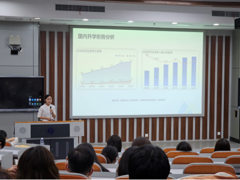 随后,余梦婷重点介绍了近3年大学生国内国外升学形势,通过对比分析引出了出国留学这一选择的优势,并对海外升学规划给出了指导建议,包括大学期间留学准备的关键节点以及共性申请材料的准备。针对学生普遍担心海外升学过于“高大上”以及需要所谓“科研成果”的误区,余梦婷结合软件工程专业一位学生的留学经历进行了分享,为与会学子成功升学树立信心。